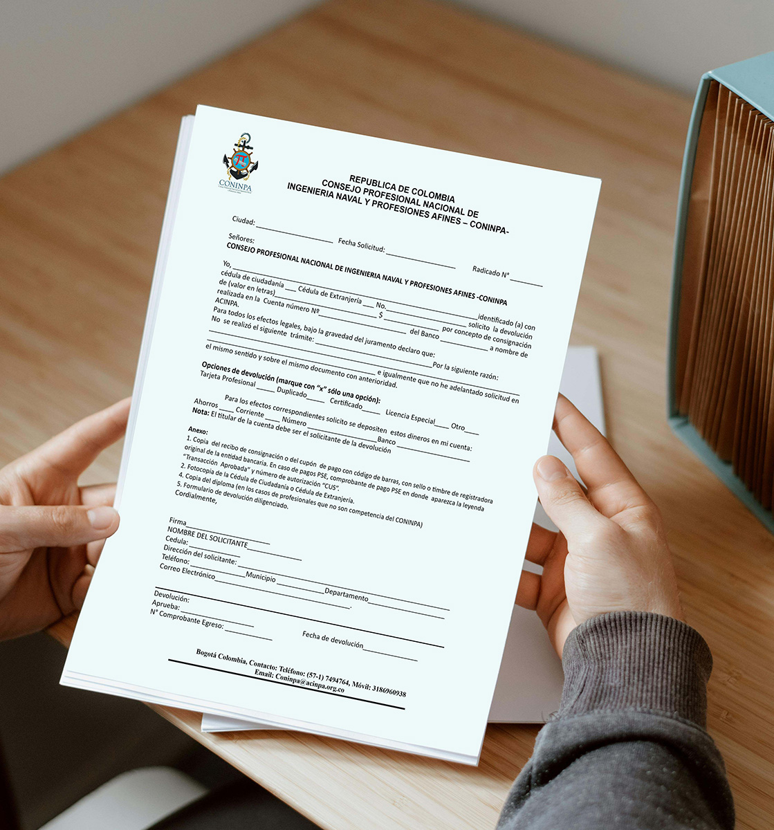 Si usted como persona Natural, desiste justificadamente de adelantar un trámite ante el Consejo Profesional Nacional de Ingeniería Naval y Profesiones Afines – CONINPA, o encuentra que consignó un valor mayor al establecido por la entidad para el mismo, debe solicitar la devolución de su dinero cumpliendo con los requisitos establecidos y diligenciando el formato de solicitud.